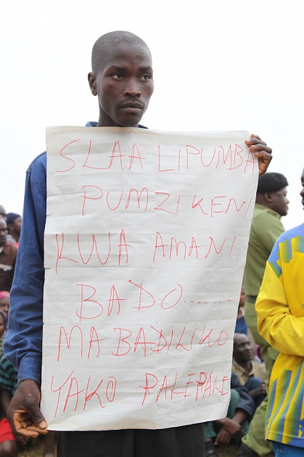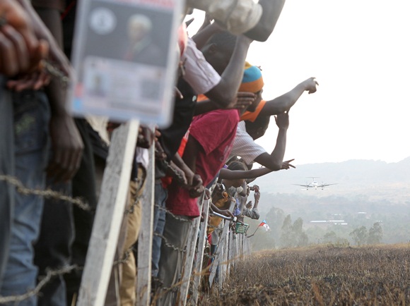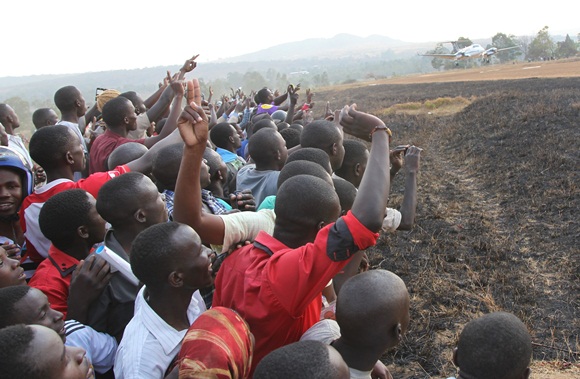 Sehemu ya Wananchi wa Mji wa Sumbawanga, waliofurika kwa wingi kwenye Uwanja wa Ndege wa Sumbawanga, wakiishangilia Ndege iliyombeba Mgombea Urais wa Jamhuri ya Muungani wa Tanzania katika mwamvuli wa UKAWA kupitia Chama cha Demokrasia na Maendeleo (CHADEMA), Mh. Edward Lowassa, wakati ikiwasili Uwanjani hapo, leo Sepremba 2, 2015.