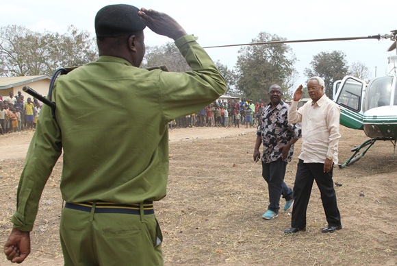 Mgombea Urais wa Jamhuri ya Muungani wa Tanzania katika mwamvuli wa UKAWA kupitia Chama cha Demokrasia na Maendeleo (CHADEMA), Mh. Edward Lowassa, akipokea saluti kutoka kwa Askari Polisi, wakati alipowasili kwa Helkopta, kwenye Uwanja wa Nguruka Kati, Jimbo la Kigoma Kusini, kulikofanyika Mkutano wa Kampeni za Mgombea huyo, leo Septemba 4, 2015.Picha na Othman Michuzi, Kigoma.