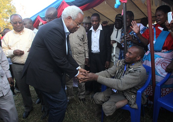 Mgombea Urais wa Jamhuri ya Muungani wa Tanzania katika mwamvuli wa UKAWA kupitia Chama cha Demokrasia na Maendeleo (CHADEMA), Mh. Edward Lowassa akimsalimia kijana mwenye ulemavu (jina lake hakupatikana kwa haraka) aliyehudhulia Mkutano wa Kampeni ya Mgombea huyo, uliofanyika kwenye Uwanja wa Sabasaba, Iringa Mjini, leo Agosti 30, 2015.Picha na Othman Michuzi, Iringa.