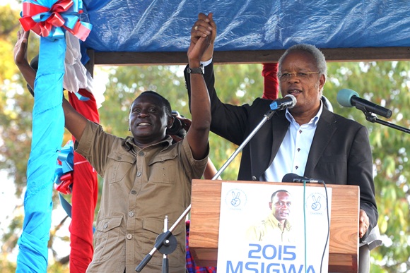 Mgombea Urais wa Jamhuri ya Muungani wa Tanzania katika mwamvuli wa UKAWA kupitia Chama cha Demokrasia na Maendeleo (CHADEMA), Mh. Edward Lowassa akimnadi Mgombea Ubunge wa Jimbo la Iringa Mjini, Mchungaji Peter Msigwa wakati wa Mkutano wa Kampeni, uliofanyika kwenye Uwanja wa Sabasaba, Mkoani Iringa leo Agosti 30, 2015.Picha na Othman Michuzi, Iringa.